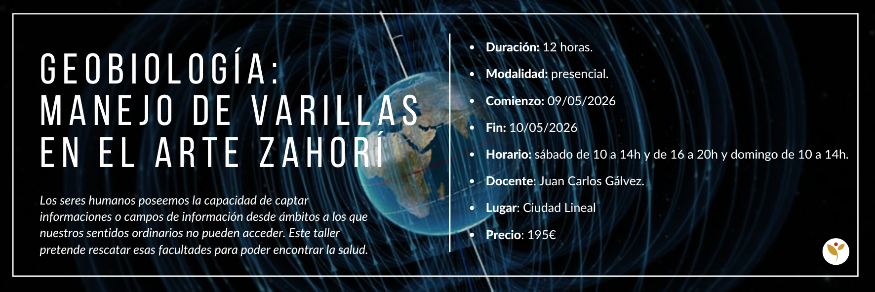 Durante el curso se facilitará el material de apuntes y de práctica para el buen funcionamiento de las clases. En el bloque teórico adquirirás los conocimientos necesarios para poder evaluar y localizar las alteraciones terrestres y para trabajar en el desarrollo de la percepción y la intuición fuera del alcance de los sentidos.