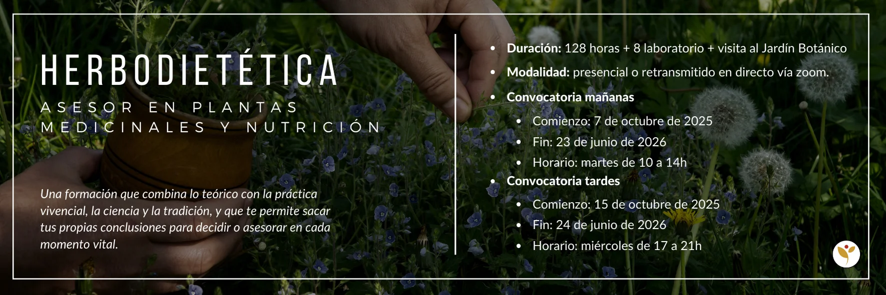De esta manera podrás realizar el curso de Herbodietética completo de 136 horas (Nutrición + Plantas Medicinales) o realizar exclusivamente uno de los dos cursos. Este año, además, hemos sacado dos convocatorias en diferentes horarios para dar la oportunidad a más personas de beneficiarse de esta formación.