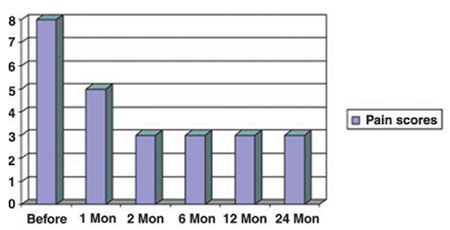La paciente experimentó una disminución importante de su dolor, pasando de 8/10 a 5/10 tras 8 sesiones, y alcanzando 3/10 tras las 16 sesiones. Este efecto se mantuvo 22 meses después de finalizar la última sesión.